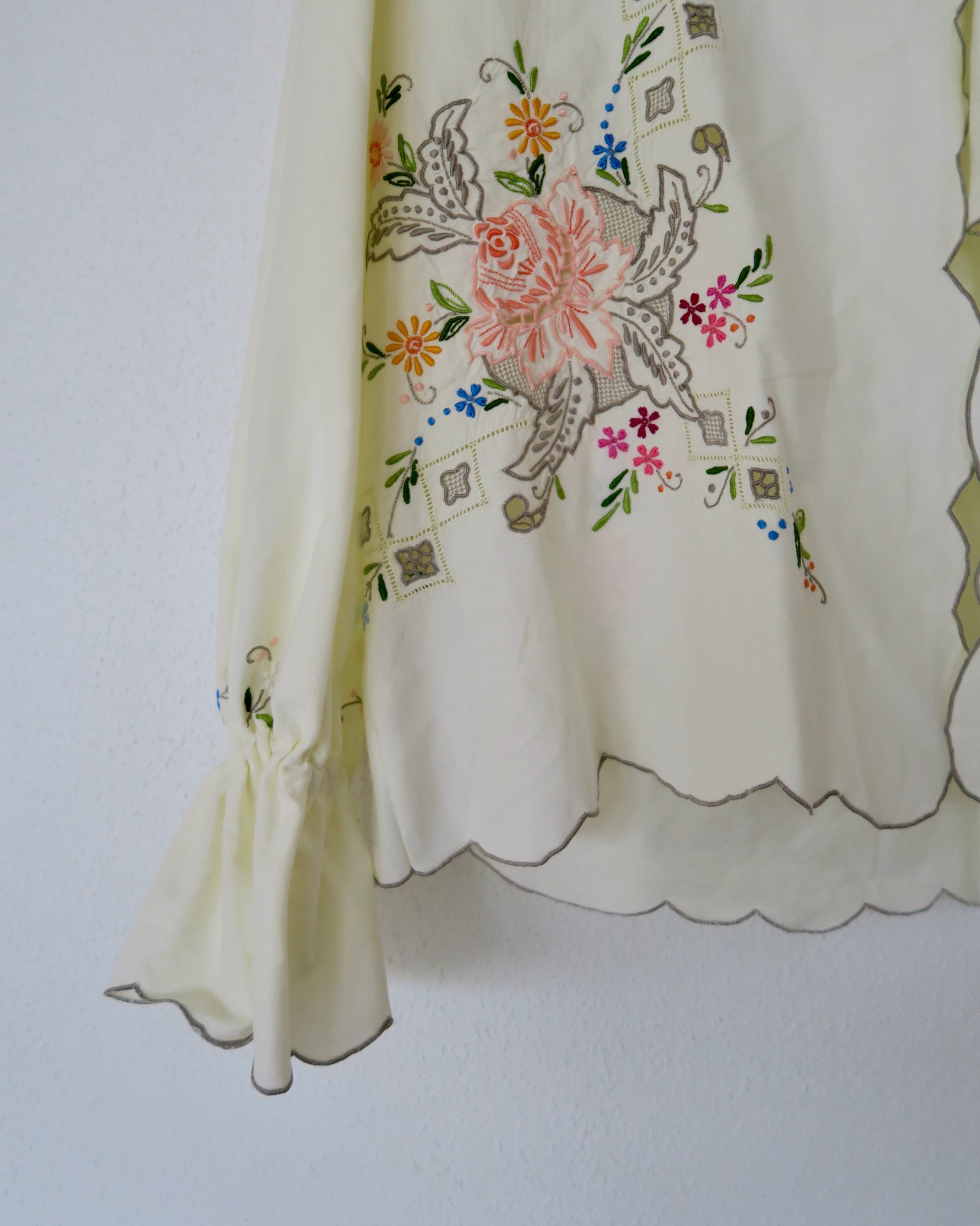 This blouse is sewn from a beautiful vintage embroidered tablecloth – found in a Danish thrift store with lots of history in every thread.