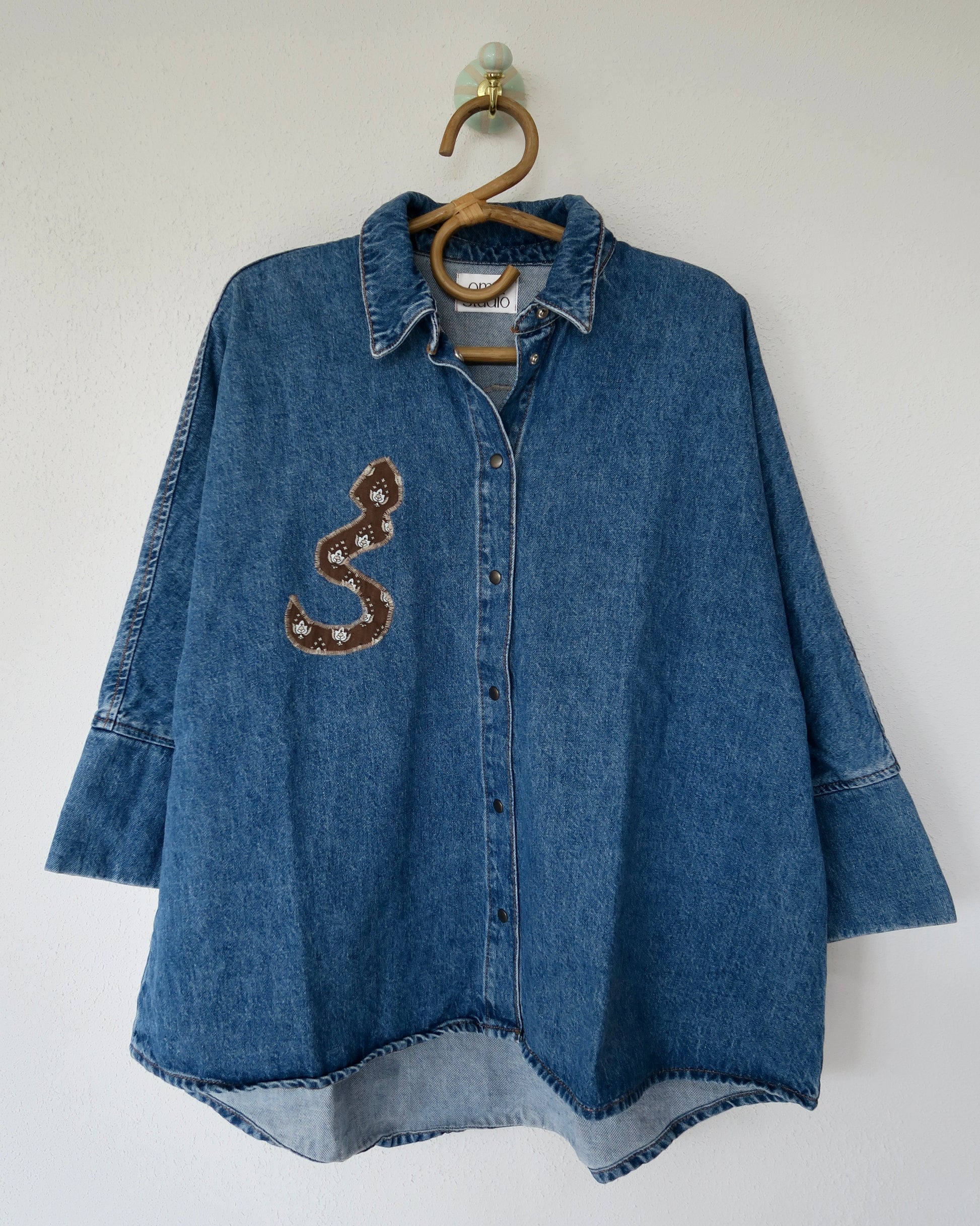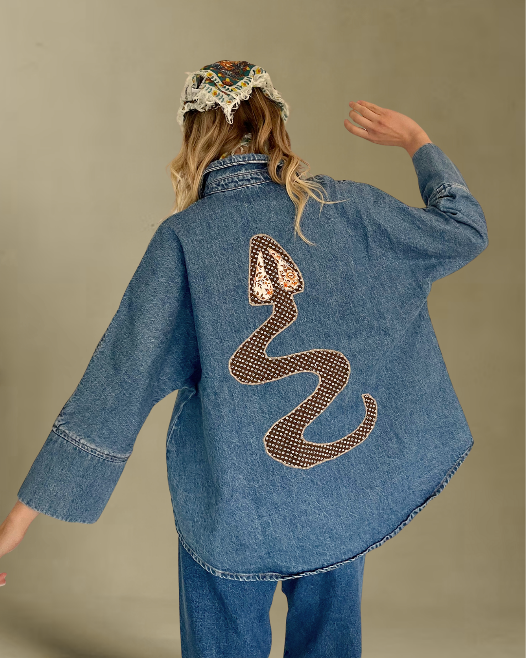 We found this denim shirt in a thrift store and immediately saw its potential. With fine patchwork motifs with snakes, it is both unique and personal - perfect for those who love the unique and appreciate sustainable craftsmanship.