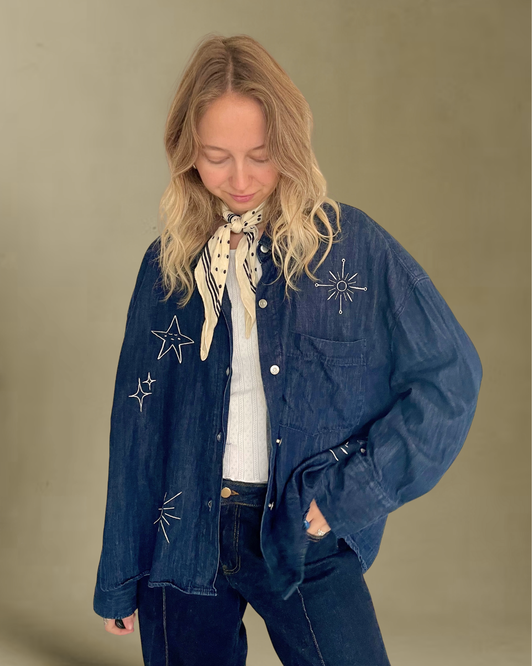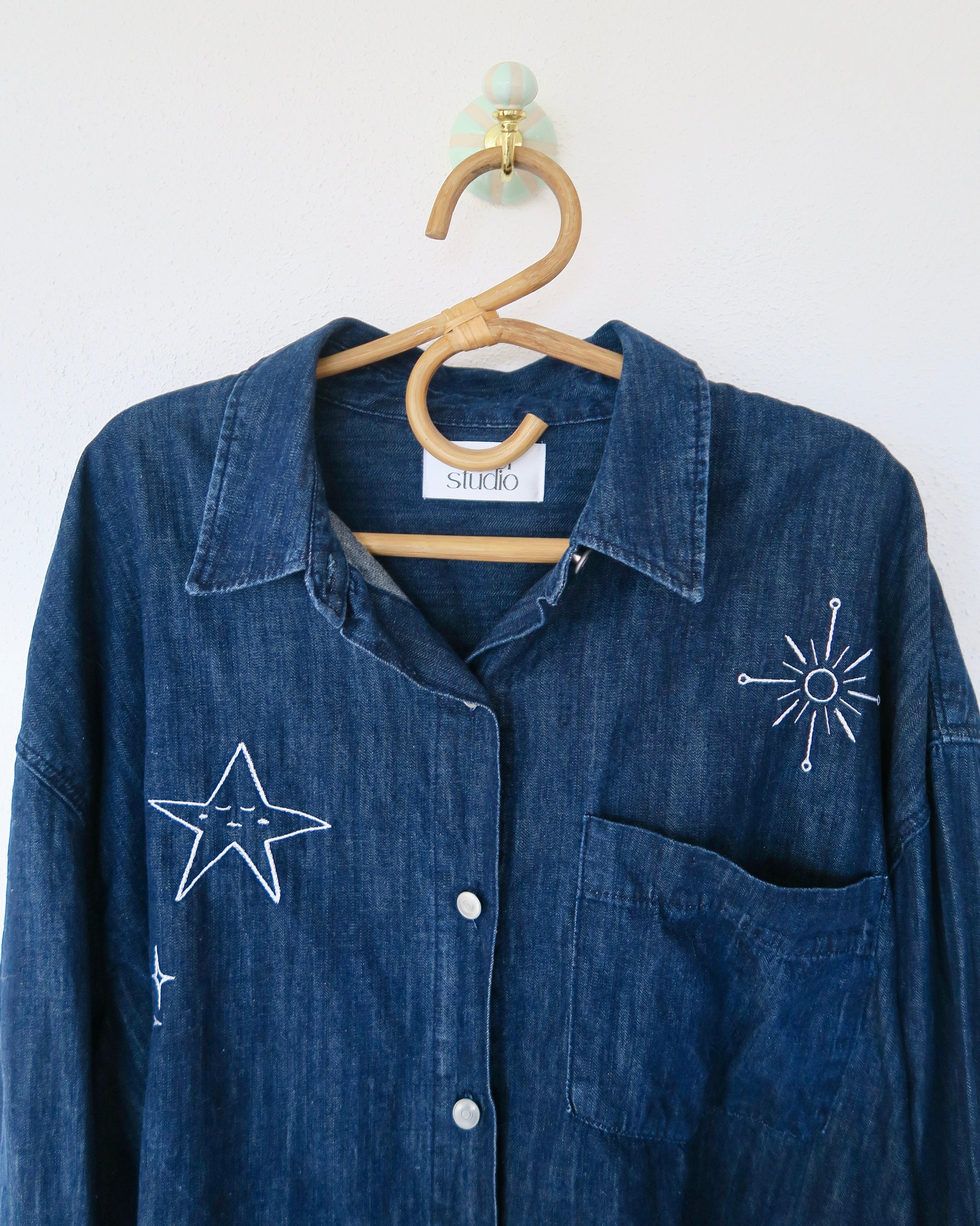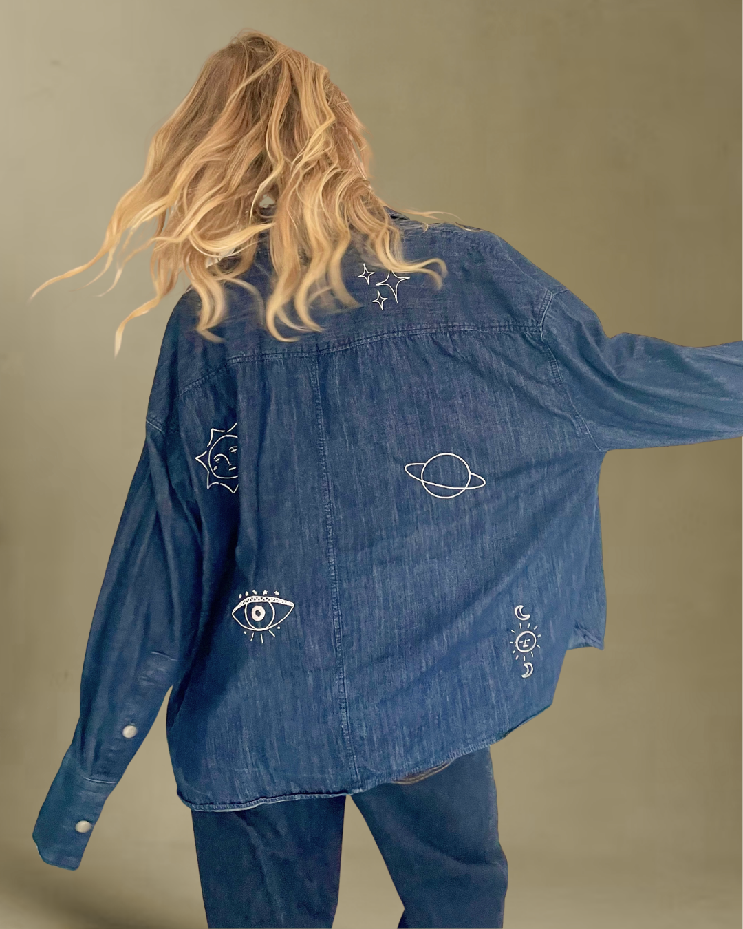 Vi fandt denne denim skjorte i en genbrugsbutik og så straks dens potentiale. Med hvide broderier har vi givet den nyt liv, inspireret af universet. De fine motiver gør den både unik og personlig – perfekt til dig, der elsker astrologi og værdsætter bæredygtigt håndværk.