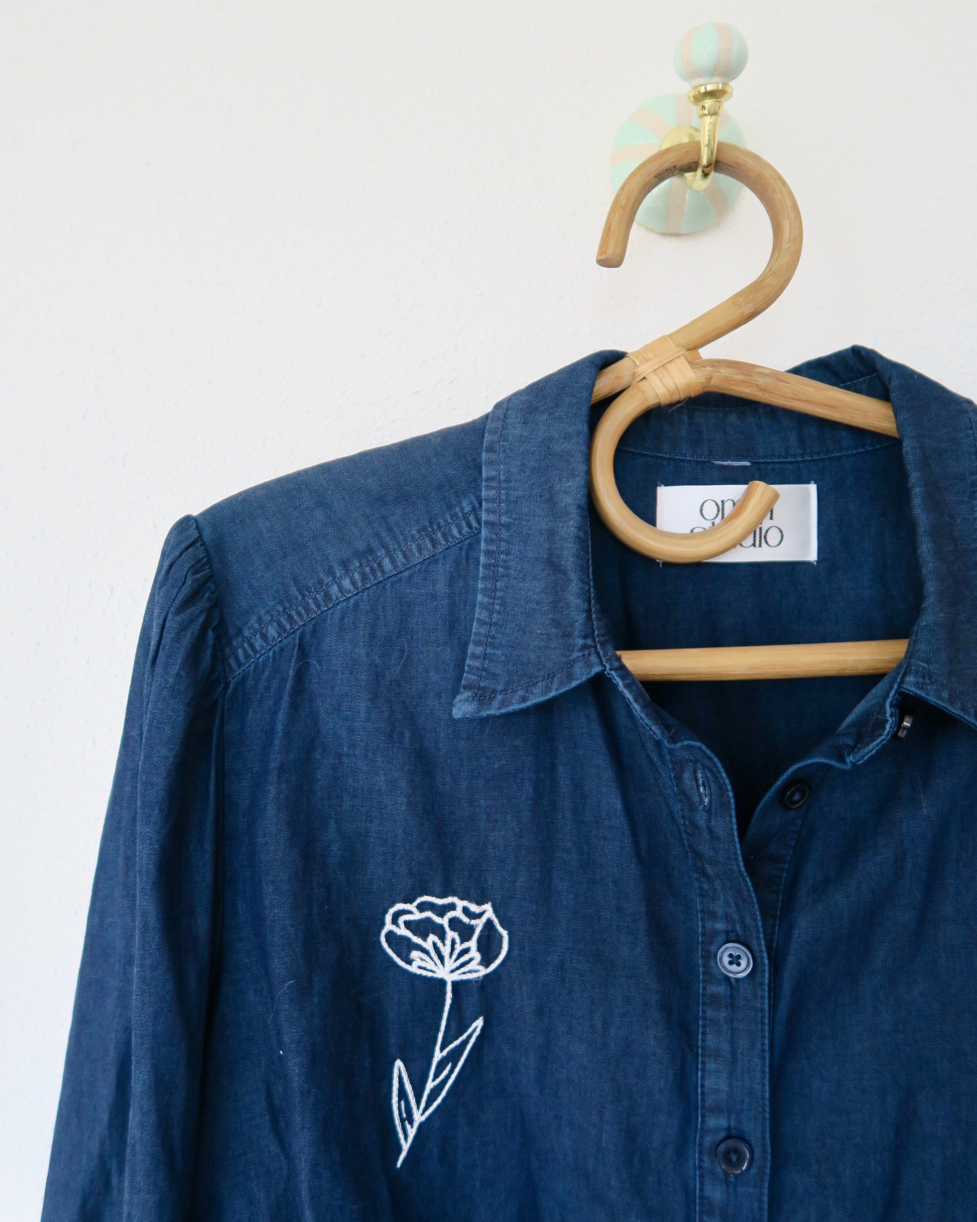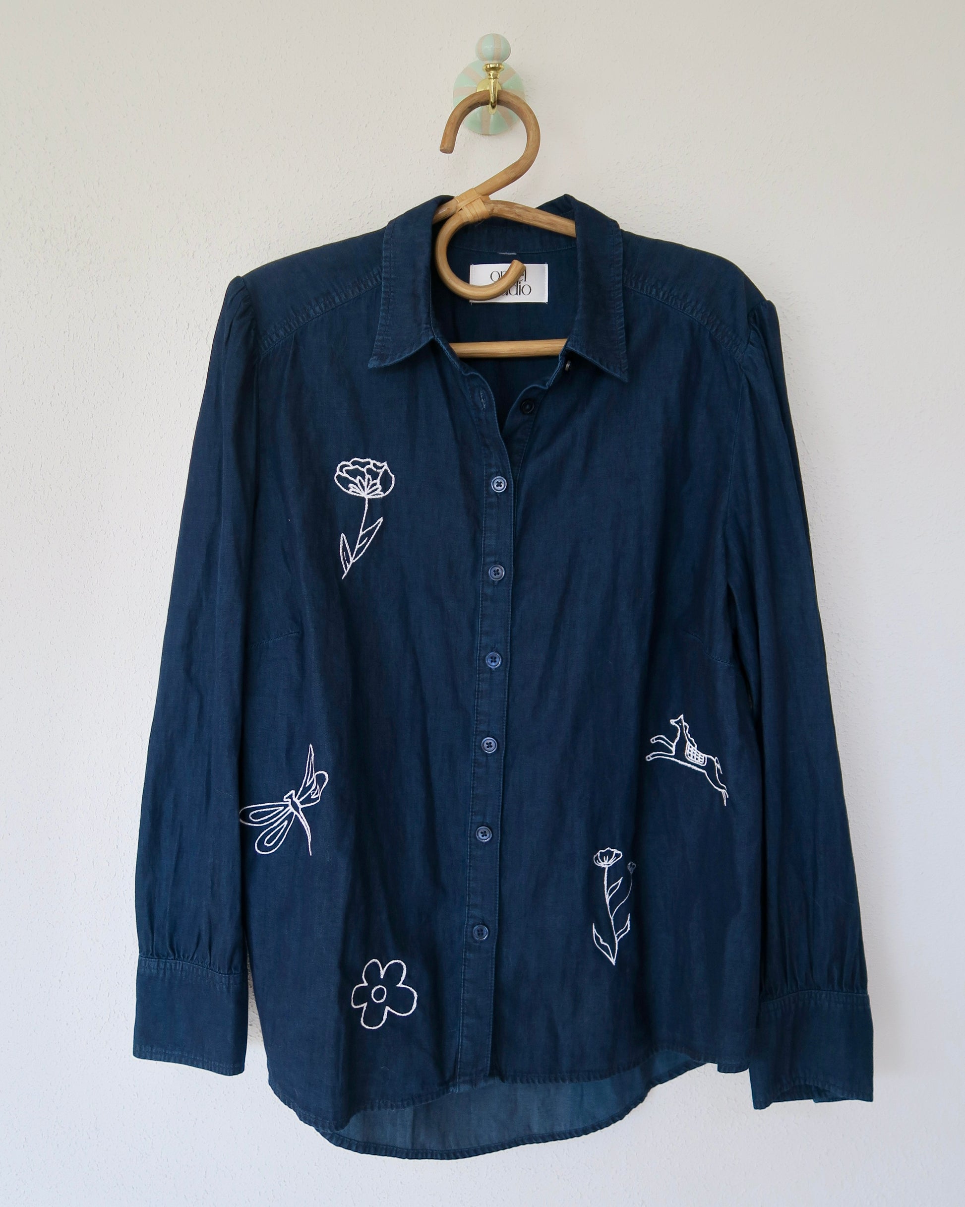 Vi fandt denne mørkeblå skjorte i en genbrugsbutik og så straks dens potentiale. Med beige broderier har vi givet den nyt liv med fine håndtegnede motiver. De fine motiver gør den både unik og personlig – perfekt til dig, der elsker broderi og værdsætter bæredygtigt håndværk.