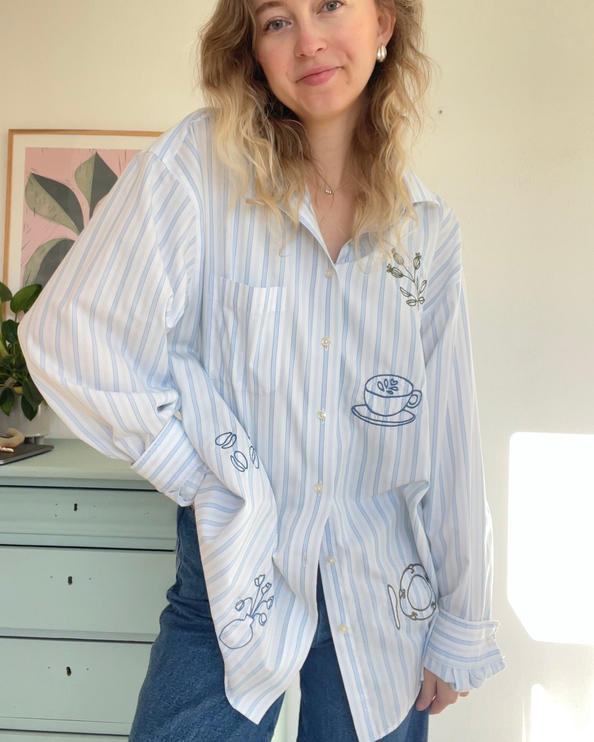 Vi fandt denne blå stribede skjorte i en genbrugsbutik og så straks dens potentiale. Med mørkeblå og mørkegrønne broderier, har vi givet den nyt liv med fine håndtegnede motiver. De fine motiver gør den både unik og personlig – perfekt til dig, der elsker broderi og værdsætter bæredygtigt håndværk.