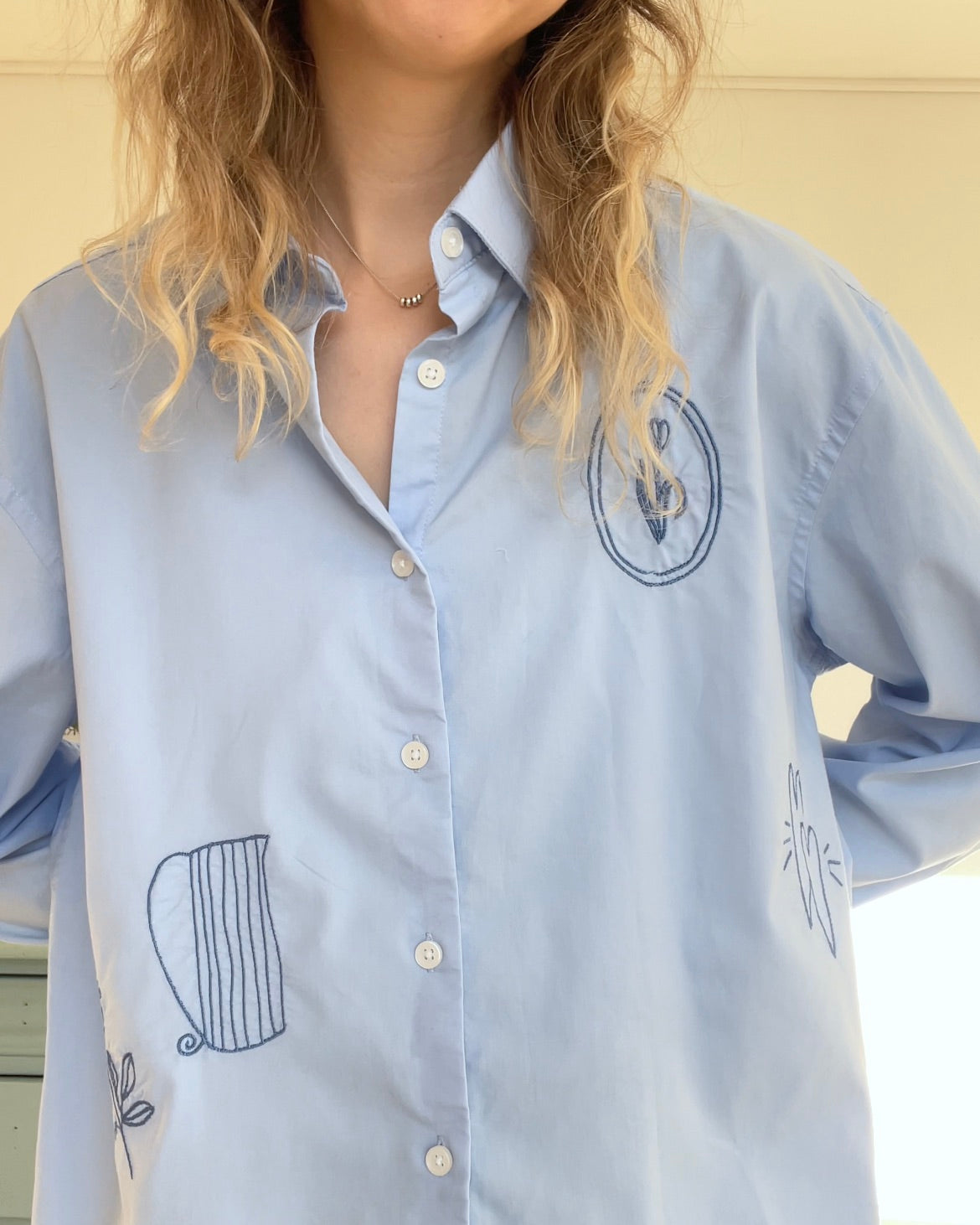 Vi fandt denne lyseblå skjorte i en genbrugsbutik og så straks dens potentiale. Med mørkeblå broderier, har vi givet den nyt liv med fine håndtegnede motiver. De fine motiver gør den både unik og personlig – perfekt til dig, der elsker broderi og værdsætter bæredygtigt håndværk.